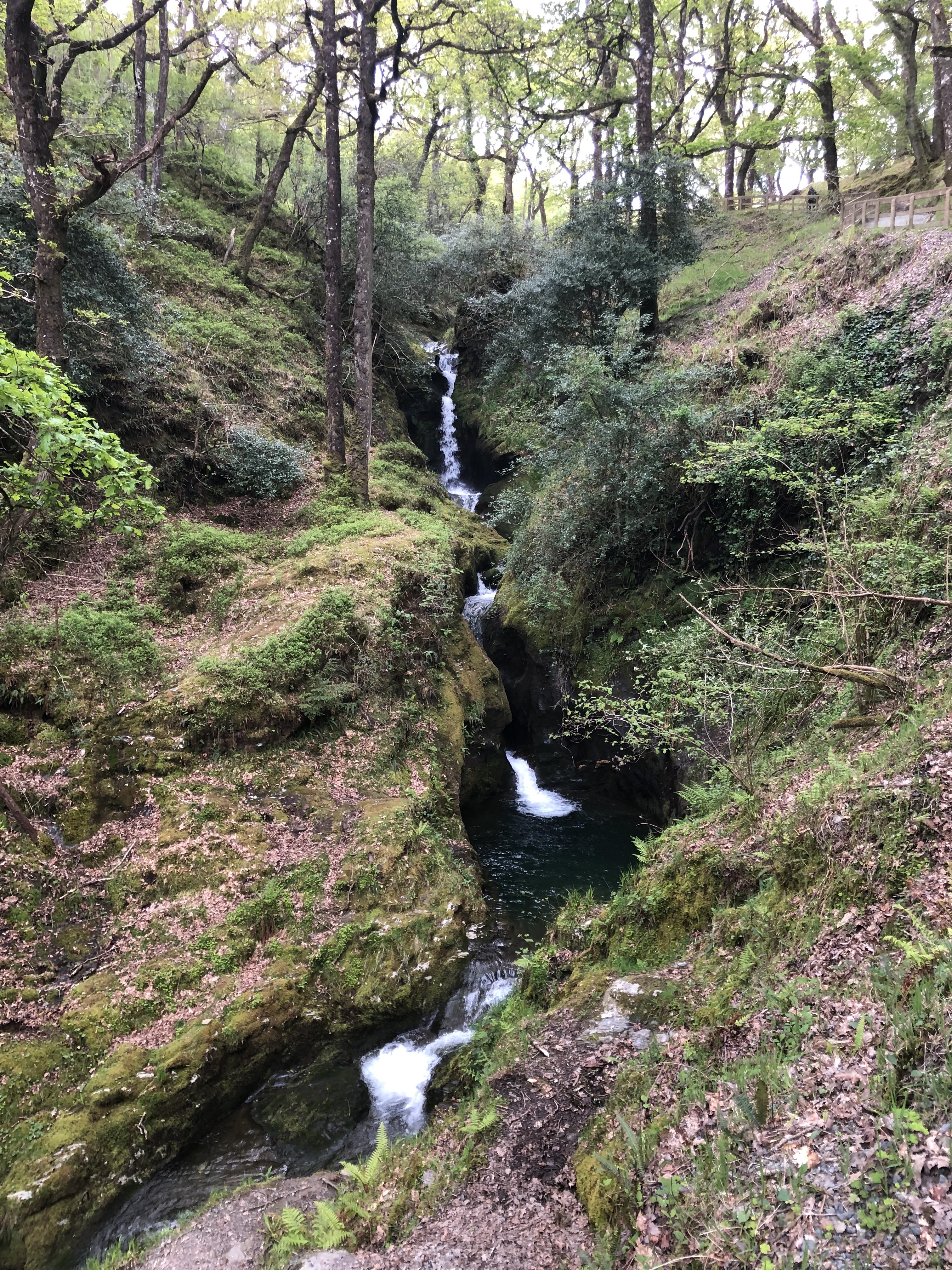 The Poulanass Waterfall trail was said to take 45 minutes if there were no moments of savoring along the way. The trail ascends on one side without any view of the falls. On the way down the trail skirts the falls and is quite lovely. It is not difficult to imagine fairies of all natures living among the trees and moss. Where the falls level off and head toward the river, I added more of my mother’s ashes to the mix. I had first visited Glendalough with my mom and my darling sisters, in the year 2000.