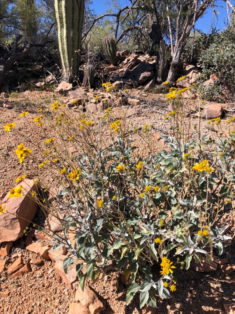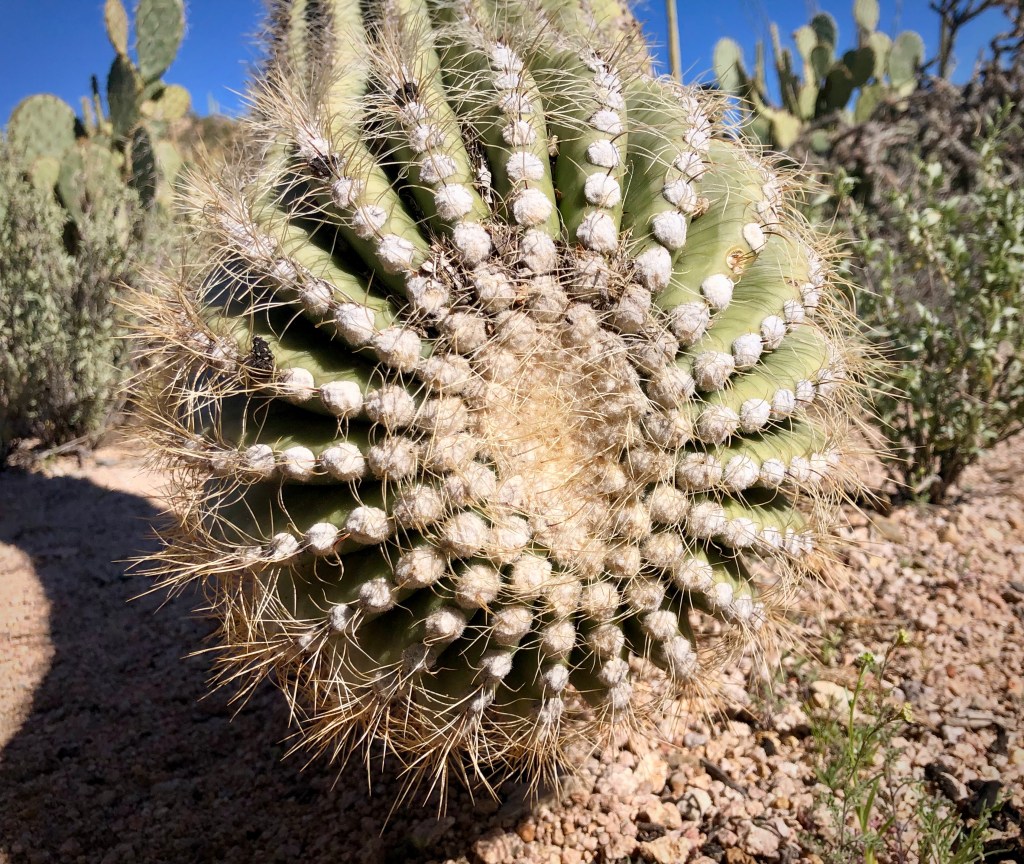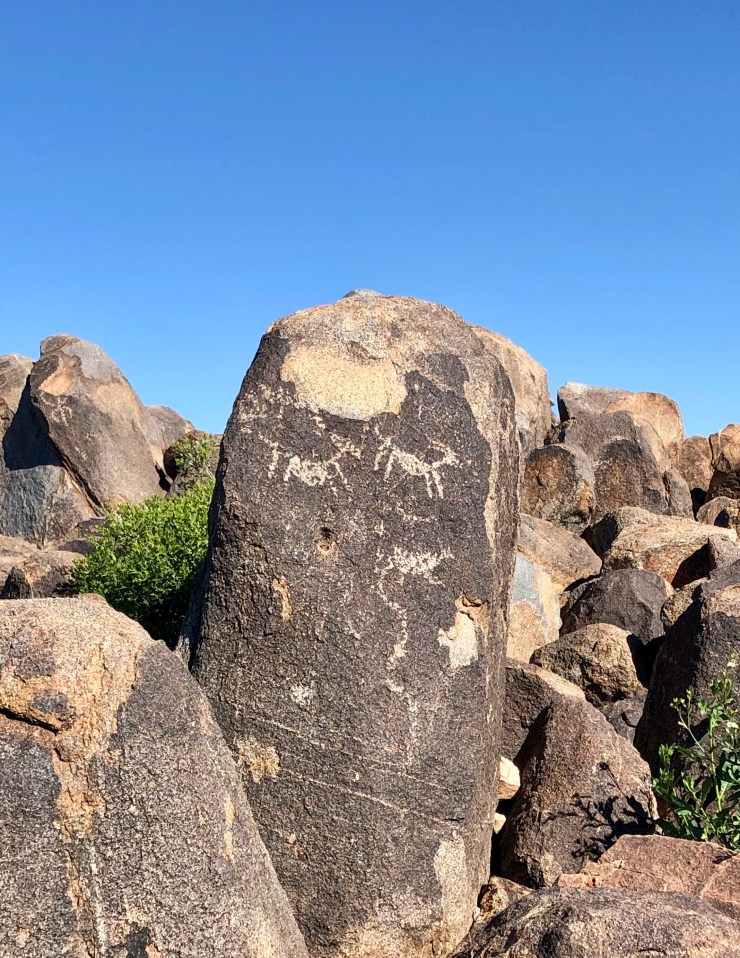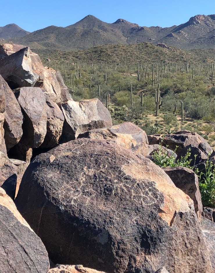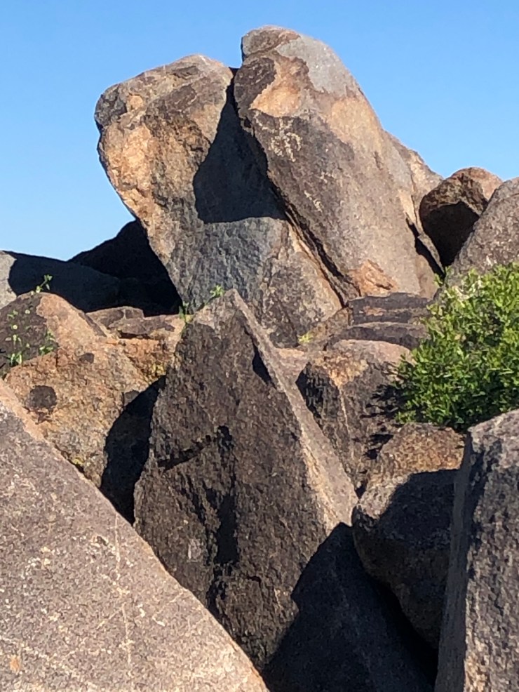 From there we took the one-way Bajada Scenic Loop road to Signal Hill. There’s a nice picnic area at Signal Hill and a well-marked trail to the top. (Round trip .3 miles.) Upon approach there were already markings (often referred to as “rock art”) on the stones above. For a vertically challenged individual such as myself, they were a bit hard to see. We took the path upwards and soon came to significant petroglyphs. These etchings were made during the Hohokam period, 450 – 1450 CE (Christian Era). We lingered here a while. It was humbling.