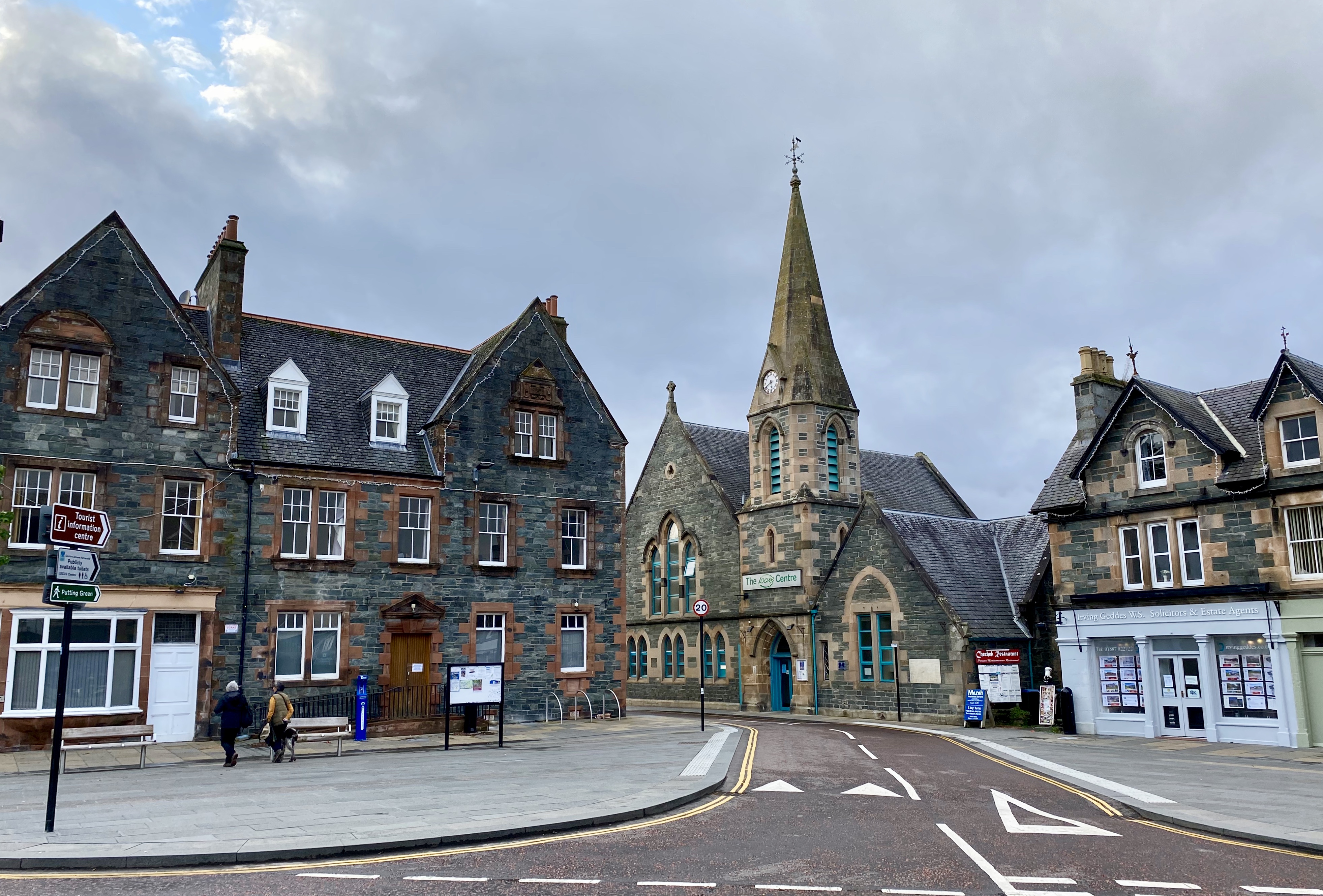 Rather than take rest, we decided to push on.  We headed back to Aberfeldy in search of a nightie.  Sally’s luggage had not arrived in Edinburgh with her!  We’d been clued to find Tofts department store; however, drove around for a while and finally settled on a place with no name that looked like it might sell clothes.  Apparently, that was Tofts.  While Sally shopped, Bill and I struck up conversation with a guy sitting on a bench outside.  Turns out he was a motorcycle enthusiast (a.k.a.biker). He had spent time with a motorcycle club in Lansing, Michigan, and had driven Route 66 as well as participated in the Sturgis Motorcycle Rally in South Dakota.  After a while his mate showed up on a Honda and joined in.