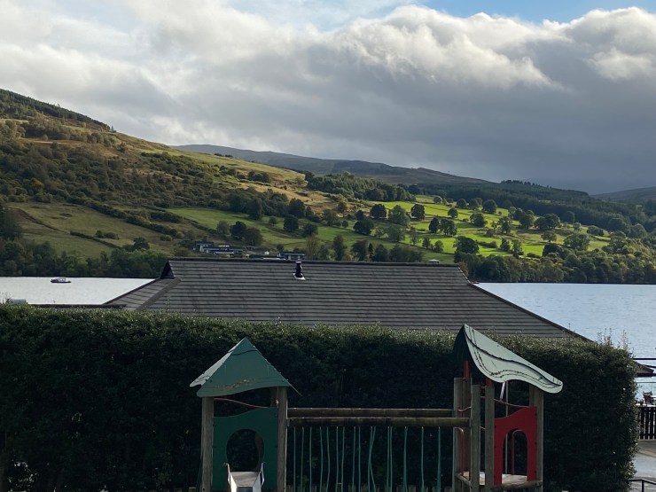 We found the car rental pick up site for Arnold Clark and soon I was following the navigation to our lodging in Kenmore.  I take my driving responsibilities very seriously when switching to the opposite side of the road.  Normally it takes my brain a while to adapt; however, this time I seem to settle right in to it.  That said, I barely dared to look at the scenery and instead focused on keeping us safe.  It took us around an hour and a half to arrive in Aberfeldy where we marveled at long row houses and uniquely Scottish buildings.  Of course there was a drizzle of rain but as we approached our little condo at Kenmore Resort we could see patches of sunlight on the hillside across Lock Tay.  The quilted pattern of yellows and greens and the sun’s rays streaming down through the clouds reassured us that in spite of all the trouble we had in getting here – it would be worth it.