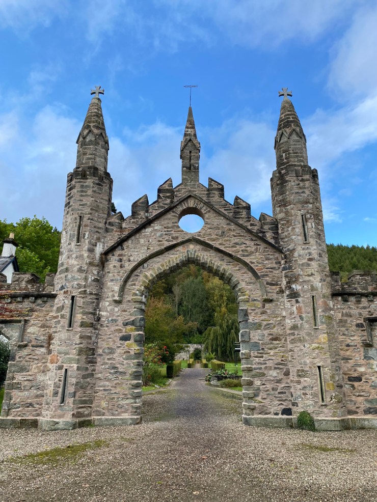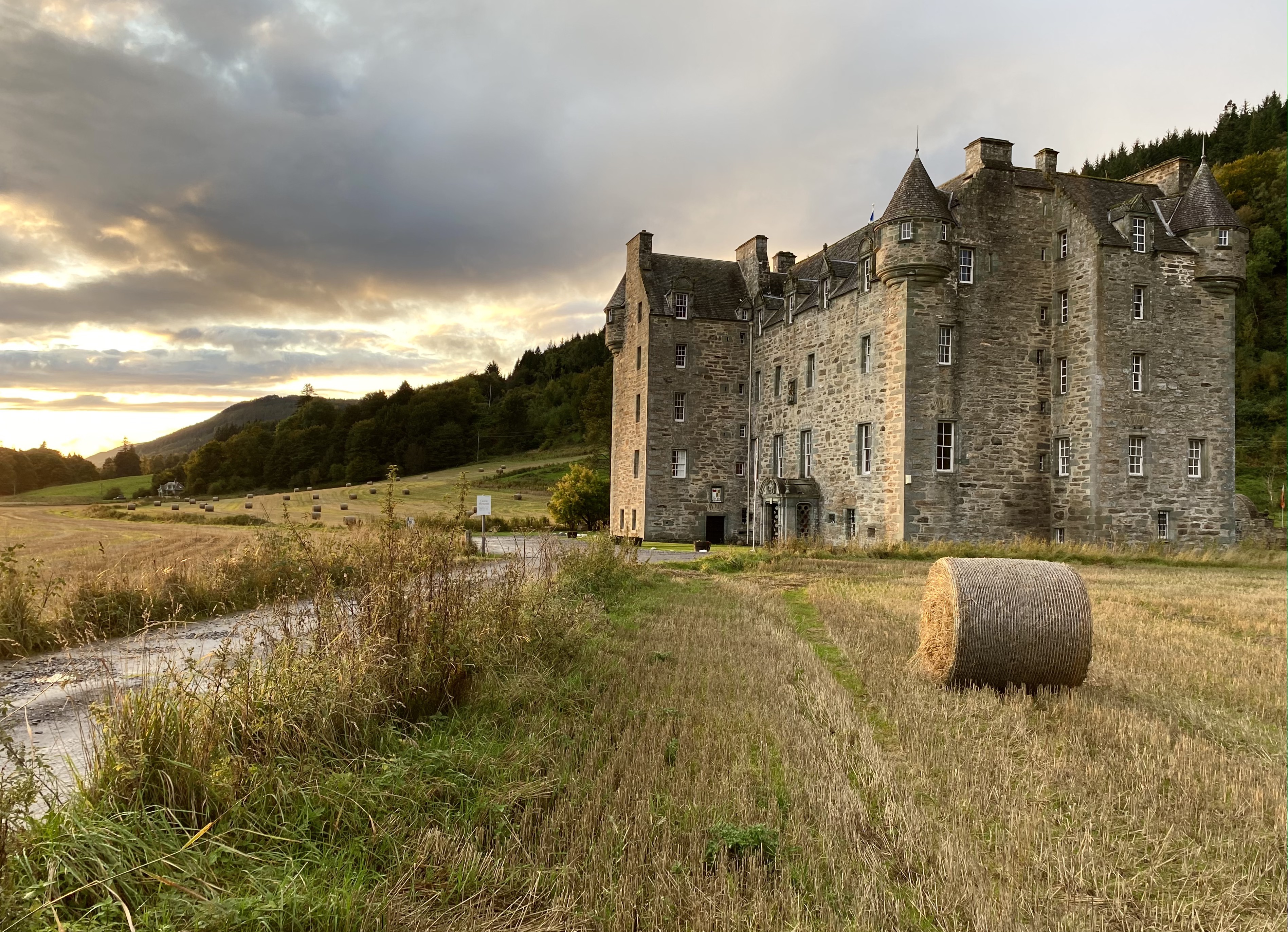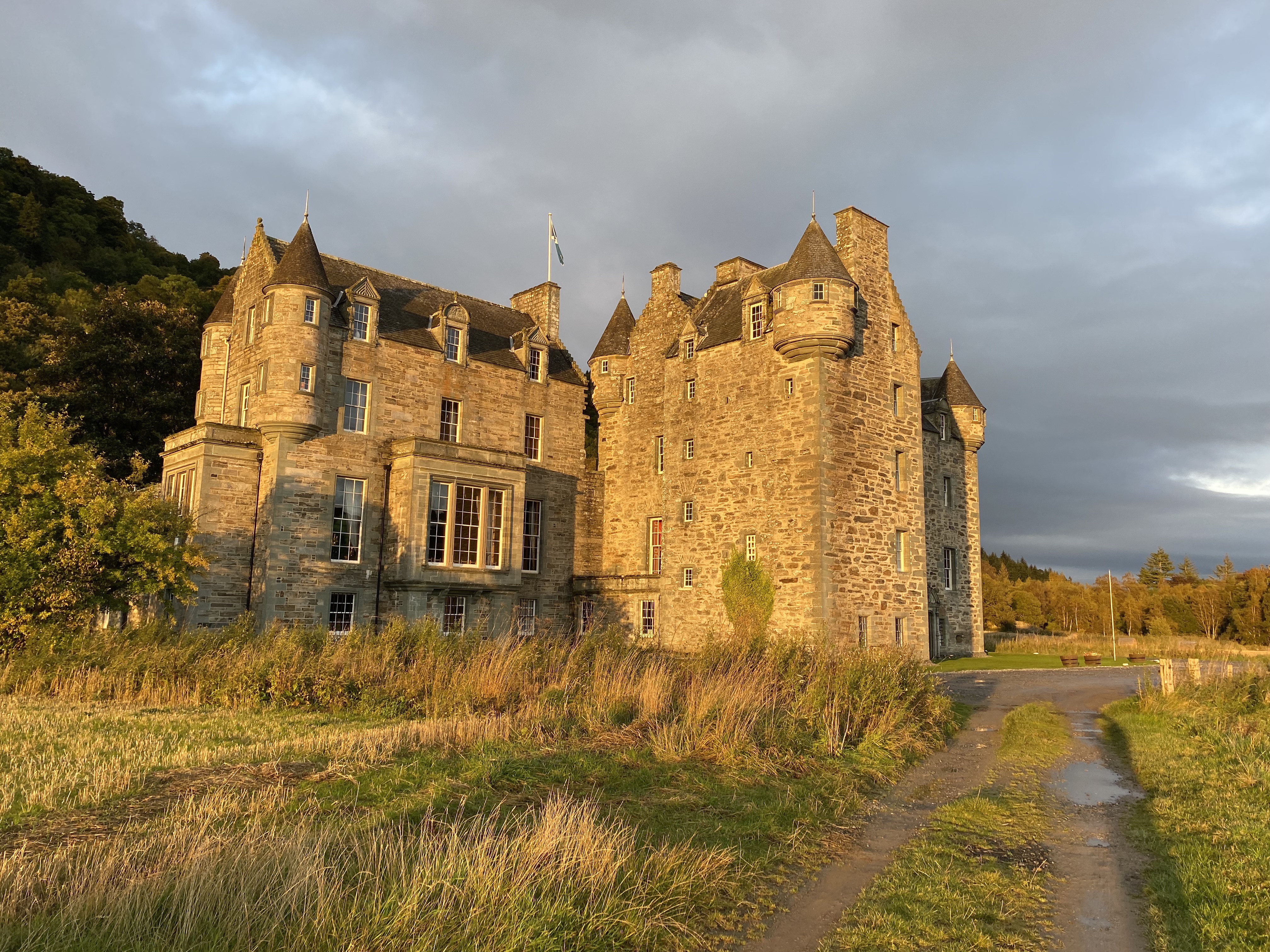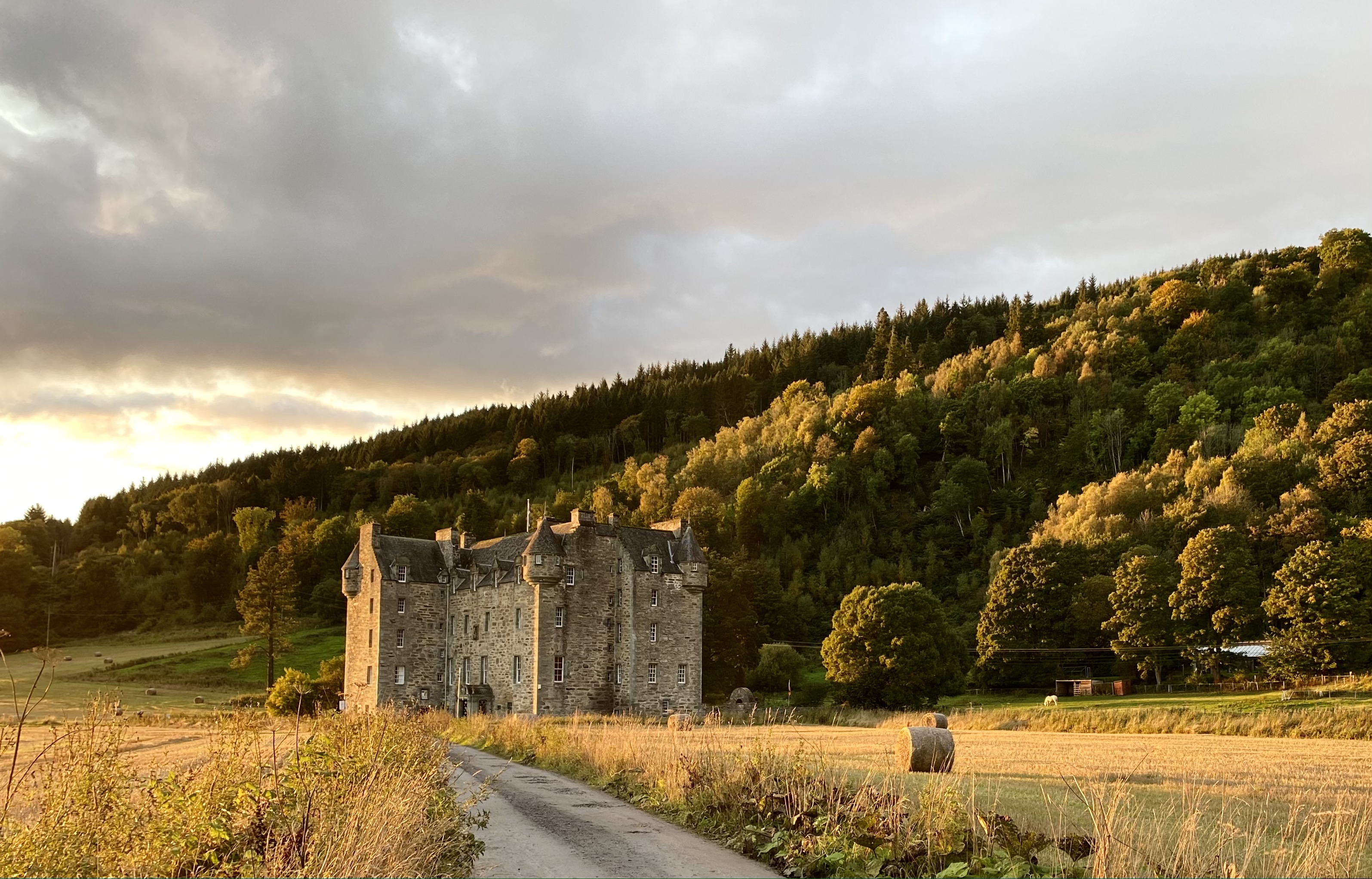 We were keen for a bite of food but the pubs/restaurants were packed (2 week school holiday).  We bought some essentials from the food co-op and headed back to Kenmore via an alternative route.  We passed a small hotel restaurant just prior to the village of Weem with outdoor seating.  After very little discussion we decided we’d go back to see if they would feed us.  Sally knew of a good place to turn around, Castle Menzies.  We drove up to the castle and decided to roam around a bit before going for a bite to eat.  The light from the sun (yes, sun!) was so lovely!