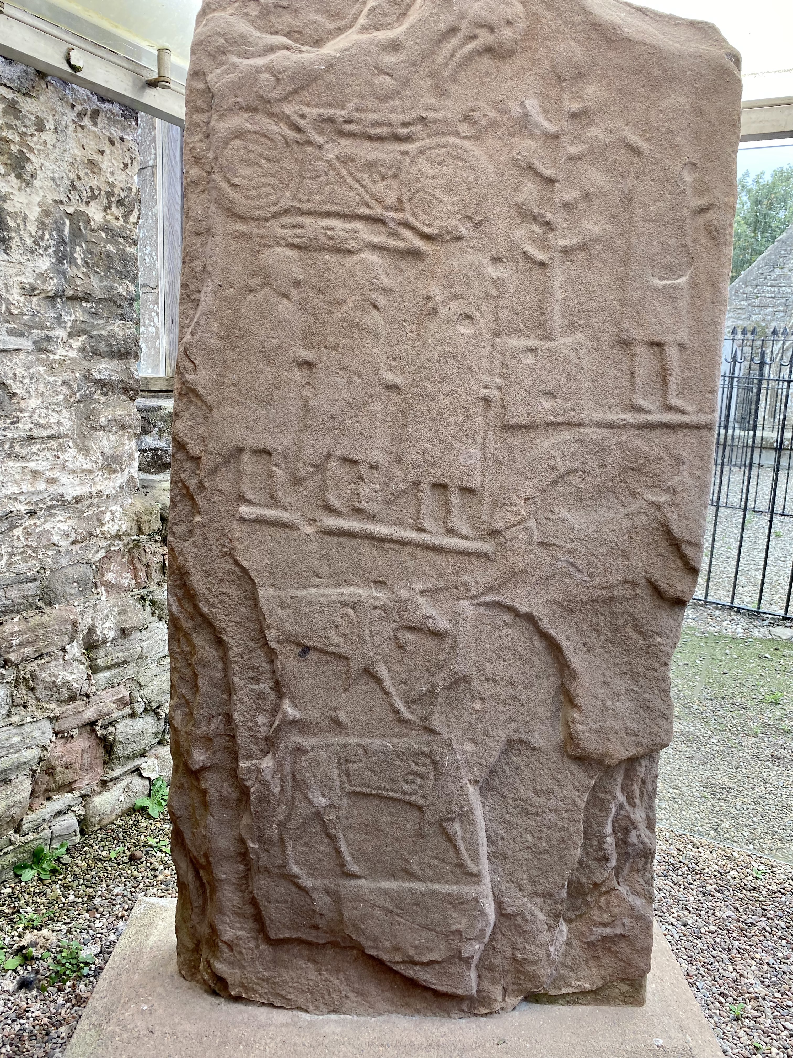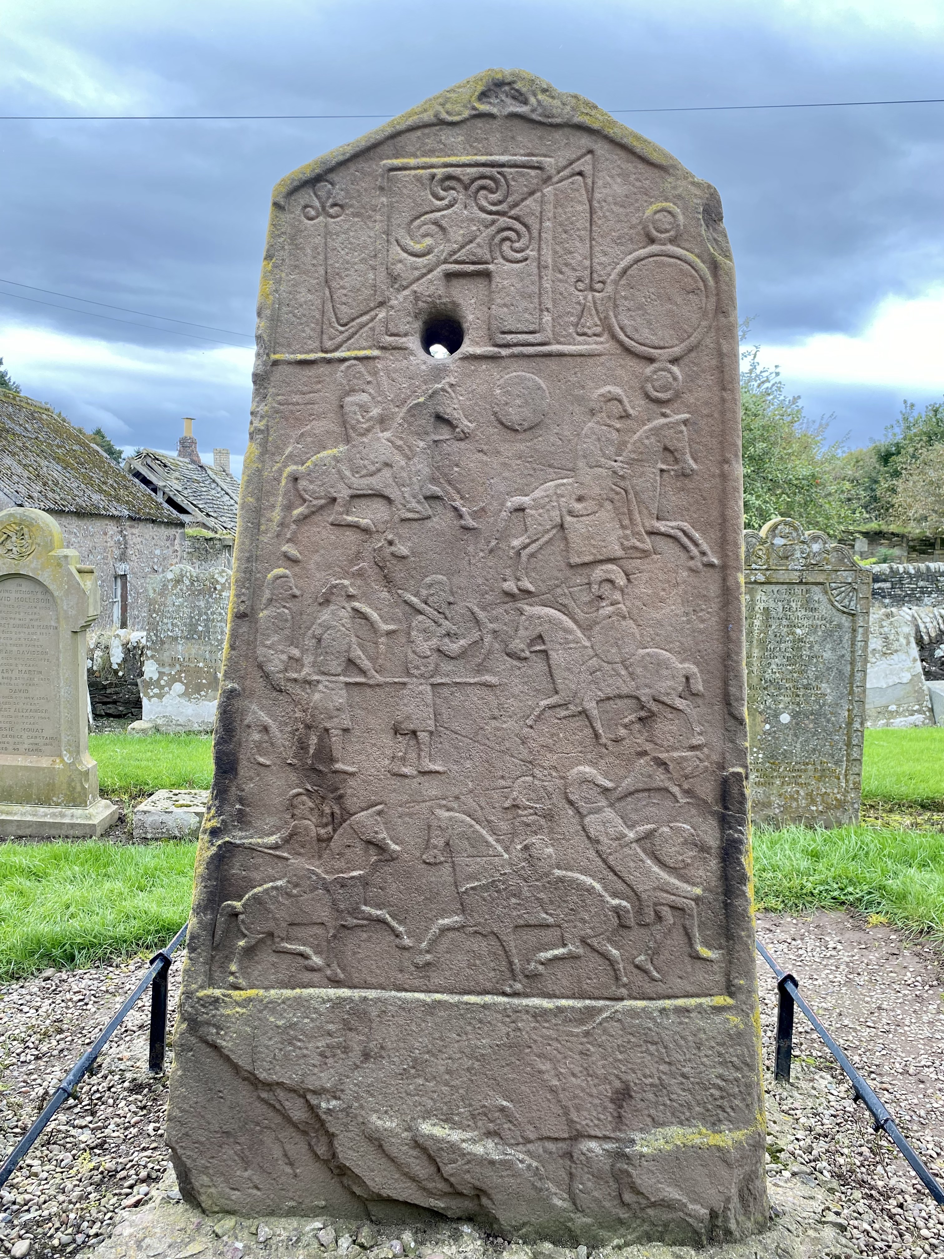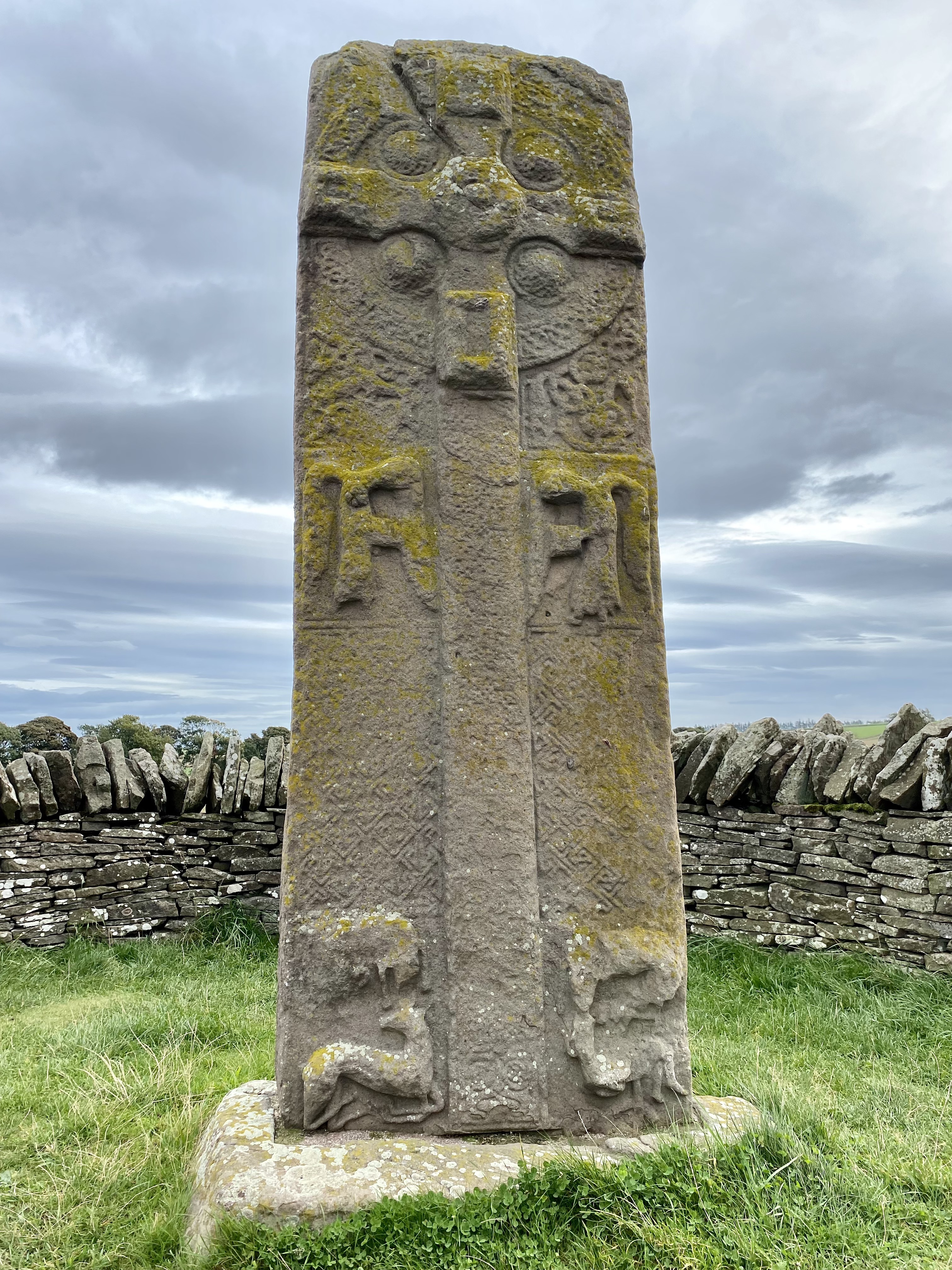 According to thegreatcoursesdaily.com, the Picts were an ancient tribal confederation of people who lived in eastern and northern Scotland. It was the Romans who named this group “Picts”. The Pictish stones we visited were believed to be carved around 600 – 800 A.D., after the Picts converted to Christianity. Our first stone was within 3 miles of Glamis Castle, located among the churchyard ruins in Eassie, it is often referred to as “The Eassie Stone”. The stone dates to 600 A.D. and was found in a stream below the churchyard. It was protected from elements and humans by a plastic shield.