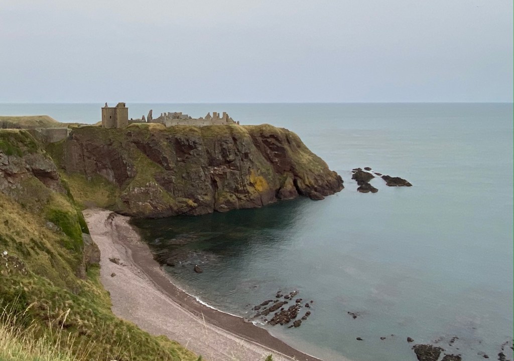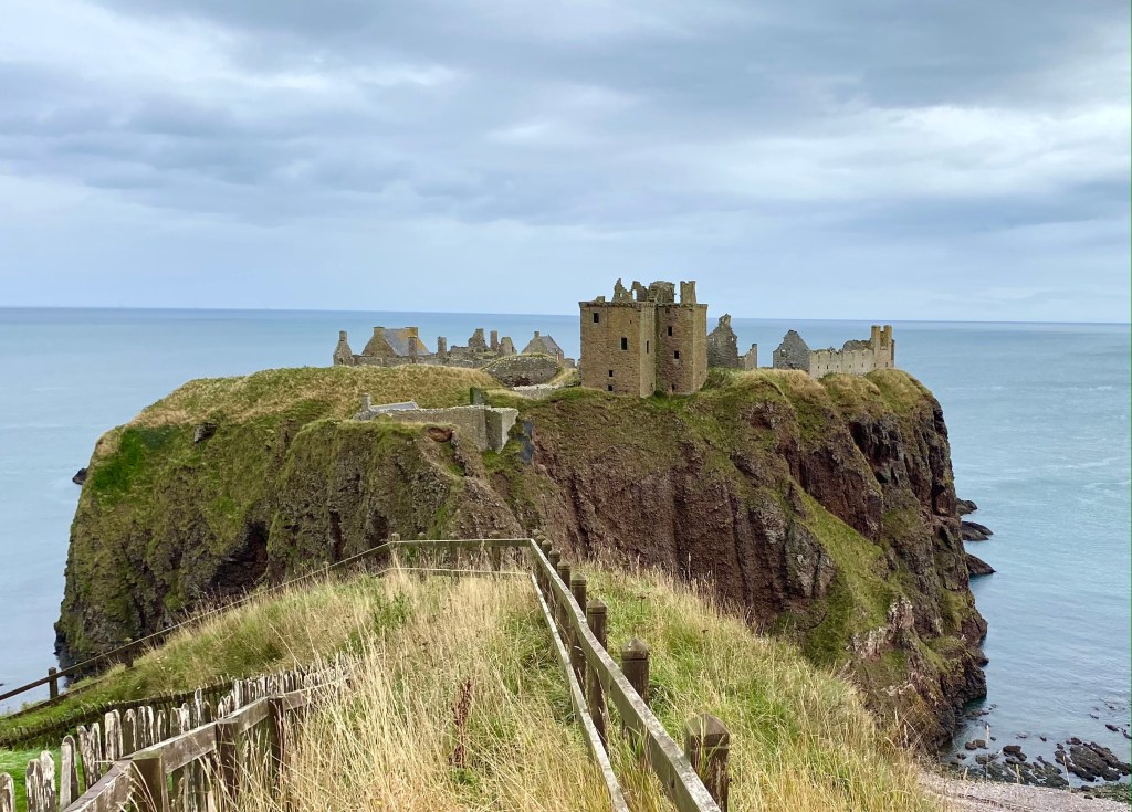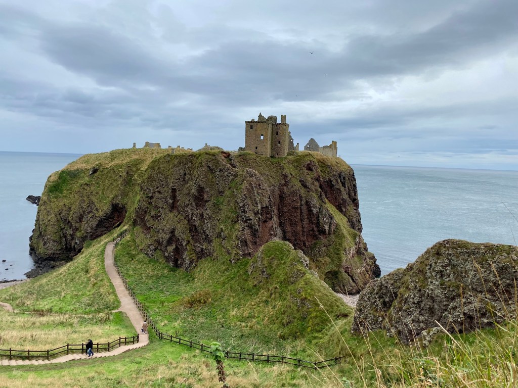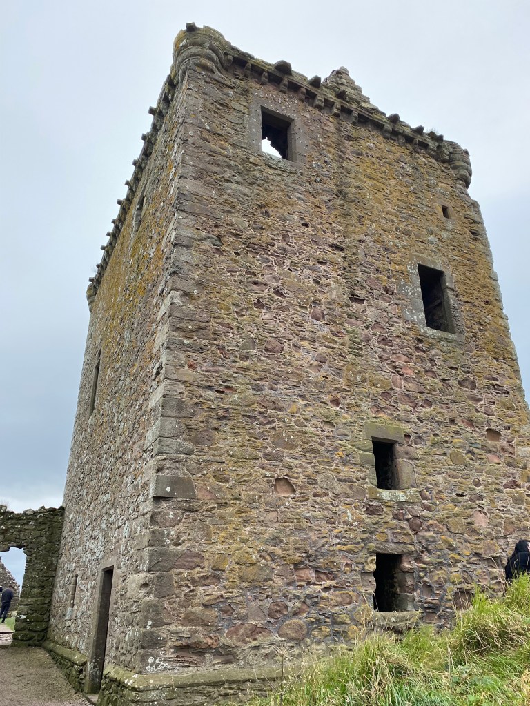 Once arrived, there was a long pathway down and then many steps more, before making an ascent up uneven stairs to Dunnottar Castle. The first stone building erected there was the chapel consecrated in 1276 A.D. Twenty years later the place was overrun by Sir William Wallace and a large massacre ensued. The Keep was erected in 1392 A.D. by Sir William Keith. There were descriptive signs throughout as well as depictions of how the place would have looked “back in the day”. We spent a good hour there exploring what remains.