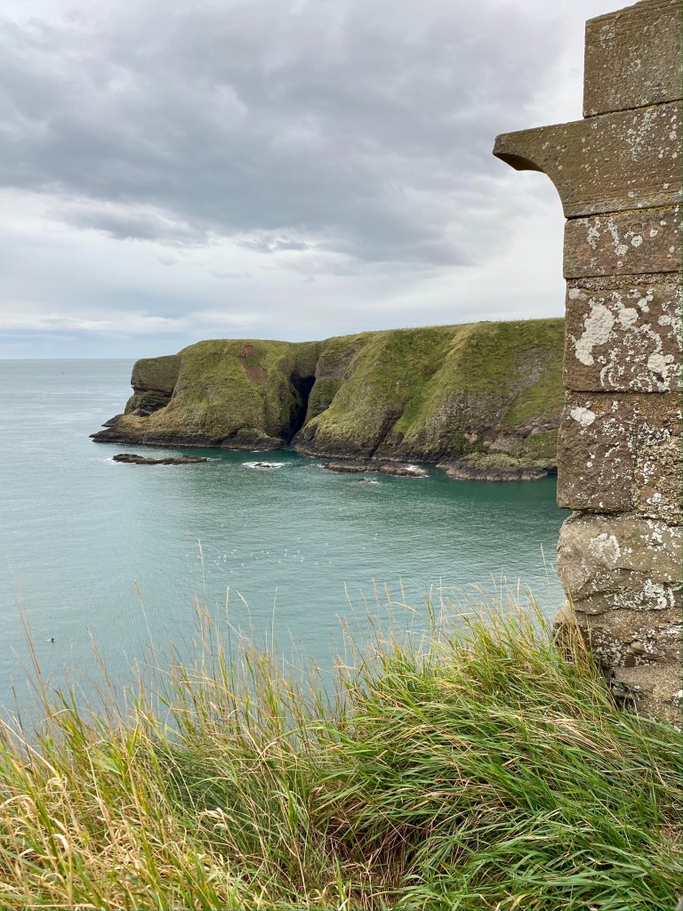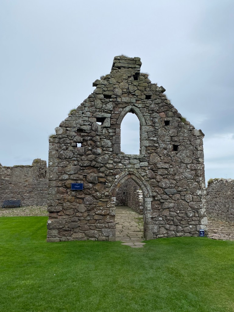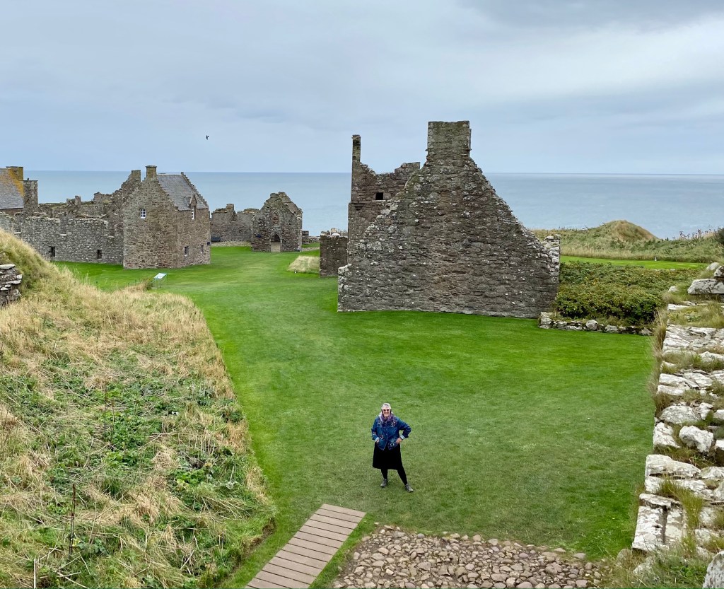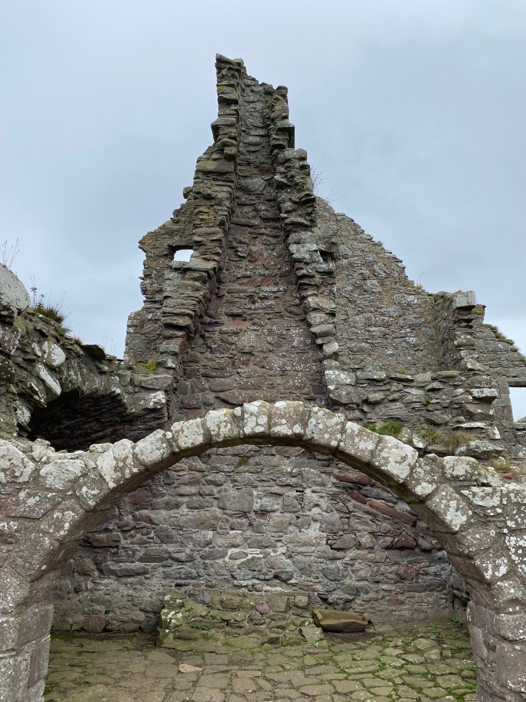 Once arrived, there was a long pathway down and then many steps more, before making an ascent up uneven stairs to Dunnottar Castle. The first stone building erected there was the chapel consecrated in 1276 A.D. Twenty years later the place was overrun by Sir William Wallace and a large massacre ensued. The Keep was erected in 1392 A.D. by Sir William Keith. There were descriptive signs throughout as well as depictions of how the place would have looked “back in the day”. We spent a good hour there exploring what remains.