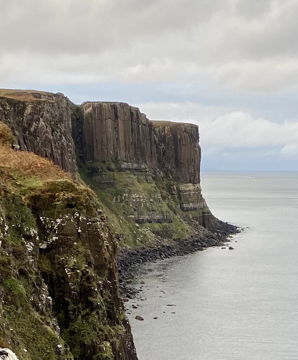 A short distance from the falls was the pull off for Kilt Rock, so named because it looks like the folds of a kilt.  The rock formation was difficult to bring into focus with pictures, but the waterfall directly in the foreground was another beauty.  The scenery was truly stunning and the wind added a bit of drama.  It was a great stop but the day was slipping away.