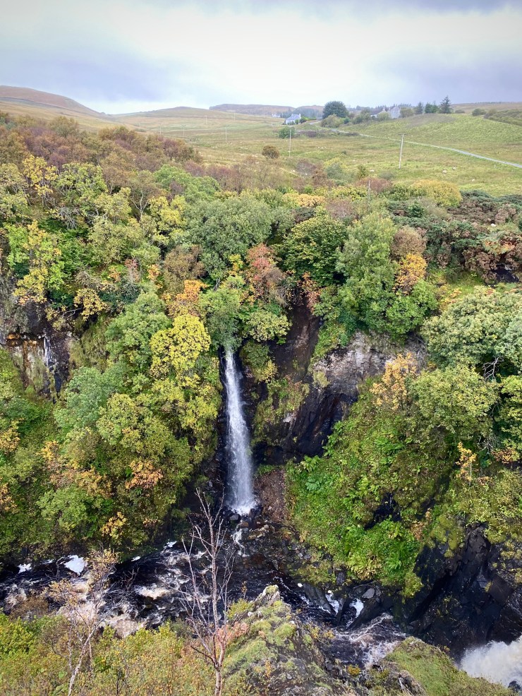 Since we couldn’t see Storr, I insisted we stop at Lealt Falls which, quite frankly, I knew nothing about.  After some pointless roaming around, we finally made it to the falls observation deck.  Initially, it appeared that there was one large waterfall, but from the deck you could see a sister falls a short distance to the east.  They were both impressive in their own right but together  – simply marvelous.