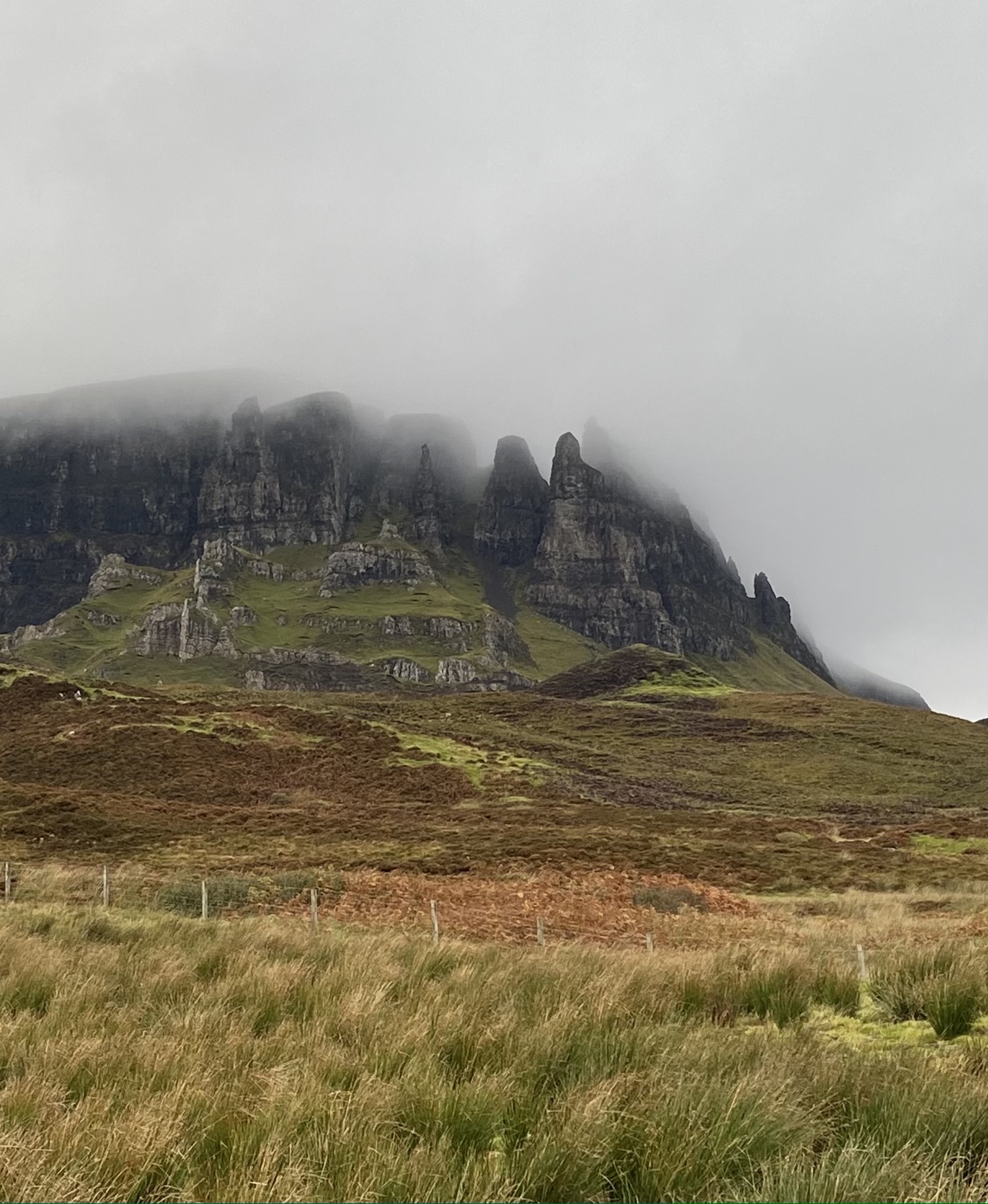 In Portree we drove around a bit searching for a perfect picture of the small seaport but the place was crawling with people!  There was no parking to be had anywhere and after 15 minutes of shuffling about, we decided to proceed up A855 to The Old Man of Storr rock formation.  Because of the (now) rain and low clouds, there was N-O-T-H-I-N-G to see at the Storr stop.  It was such a bummer to be on the beautiful Isle of Skye and see nothing but clouds.