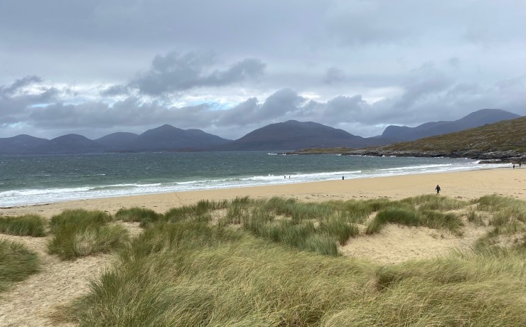 From St. Clement’s we traveled clockwise around Harris to the famous sandy beaches. We took a short hike back to Luskentyre Beach in the fiercely blowing wind and cold. This beach is often photographed and on a beautiful, sunny and less-blustery day, could be mistaken for someplace in the Caribbean. Not so much so today though bits of sunshine attempted to find us.