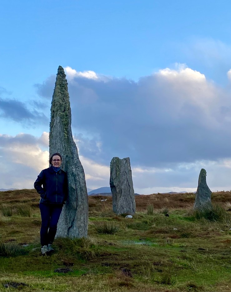 Set apart from Callanish I were Callanish II and Callanish III. Callanish II has very few stones but the traingular stone in the group picture is also the stone I’m standing next to in another – just to provide perspective. Callanish III proved to be very soggy to access so the other, perhaps wiser travelers watched from the car as I scampered up (though the mud) to take a more intimate look. I love exploring!