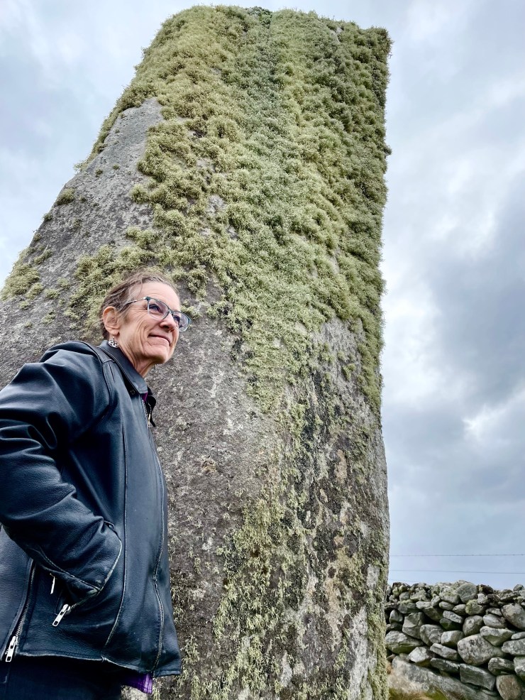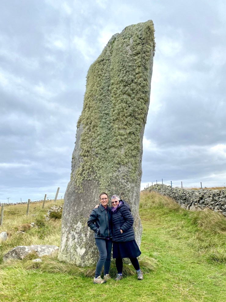 We then went in search of Clach an Trushal or the Trushal Stone. This stone stands 15.5 feet high and is said to be the tallest standing stone in all of Scotland. It is located down a narrow secondary road in what nearly seems to be in a farmer’s field. In fact, when we turned the corner to the site there was a cow who had escape the fence and was contentedly hanging out on way truly was less green grass on the other side. Without someone standing next to the stone it is impossible to judge the height.