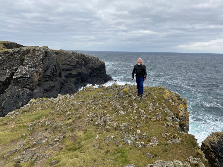 The last place on our list of “must-does” today was the Butt. Yes, the Butt of Lewis. We had visited the southern-most location on the Isle of Harris and the Butt was the northernmost location on the Isle of Lewis. There was a lighthouse there and very spectacular cliffs. My sister Sally truly pushed her comfort zone peering over those jagged edges. The water was so blue, the wind was blustery and cold ,but the sense of adventure really made it seem quite tolerable. (That’s Bill on the edge of the cliff with the lighthouse to the right!)