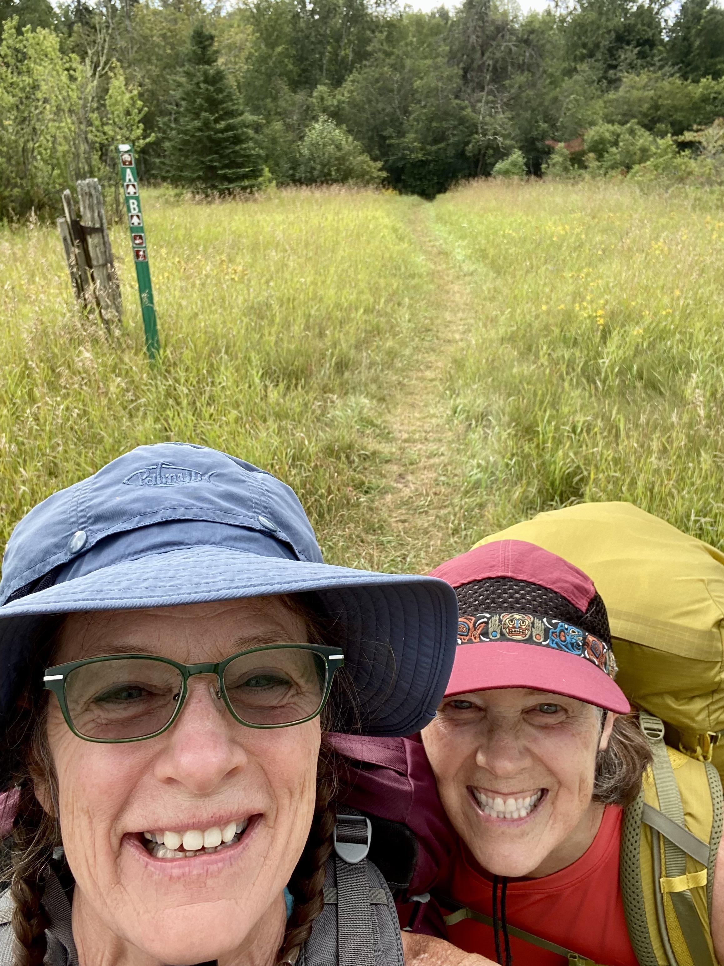 We headed to the Au Sable (aw-saab-ble) Light Station just a quick .4 of a mile down the trail. There were abundant blueberries along the trail, and I savored many! Volunteers staff the light house during the summer months and those we met this day were kind and friendly. We rested a while under blue skies and to our delight, discovered that there was also cell phone coverage at the lighthouse. We had said our good-byes to our men; but it was a nice surprise to be able to assure them that we’d made it through Day One with very few obstacles. Wanting to preserve our phones for picture-taking our conversations we were very brief.