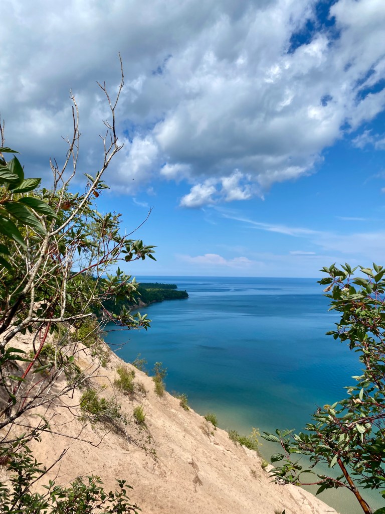 At around 12:30 PM we reached the log slide overlook and took a little rest. According to the National Park Service, “The Log Slide Overlook sits 175 feet atop the Grand Sable Dunes. It is so named for a wooden chute that early logging companies used to slide logs 300 feet down the sand dune to Lake Superior.” Would that we were youngsters, we may have jumped down that dune to the bottom…pretending to fly each time our bodies left the ground. The fact that we were older reminded us of the brutal climb back up the shifting sands of the dune. No, we were taking rest, albeit brief. From the top of the log slide we could see the Au Sable Light Station.