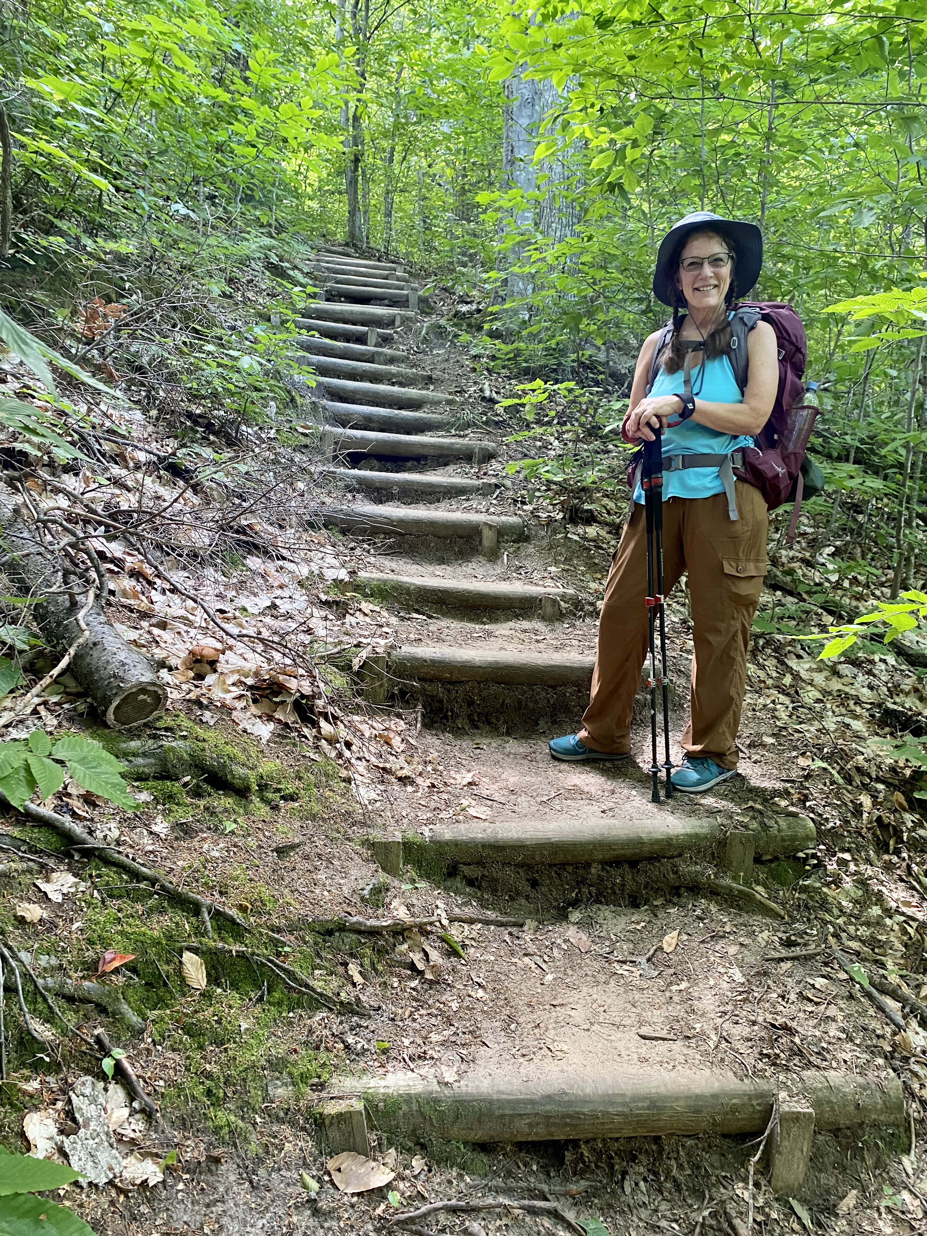 Perhaps 50 yards into our hike, our brains began firing that we weren’t seeing any of the North County Trail signs but plenty of cross-country skiing signs. Yes, we had headed down WRONG TRAIL! We made a quick turn-around, embarrassingly confirmed with two other hikers that we had indeed located the proper trailhead and were off by 8:50 AM. A short distance down the trail we encountered our first bear scat as well as a light rain. We donned our sexy ponchos and continued. We came to a place where the sign directed us to walk down the road with our backs to the traffic for half a mile. Rule followers that we were, this was a difficult ask. Not only that, but having already established that we were two, semi-confused women…how far was a half a mile? We walked along the road by Grand Sable Lake. The guys we had briefly spoken to at the trailhead were behind us and eventually caught up. They had done the trail multiple times and assured us we were heading in the right direction. The trail was mostly through forested areas and not too difficult. The rain stayed light and ended within the hour. Penny chatted with lots of chipmunks along the way.