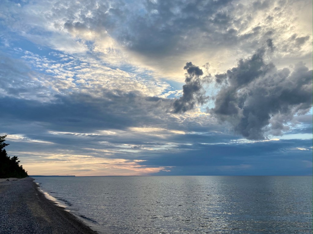 We went back down to the beach to watch for sunset. We saw storm clouds to the east and west of us. Also noted two ships on the horizon, one a 1,000-footer. It was a bit of a dune climb to get back up from the shoreline. We were exhausted. My step counter recorded over 31,000 steps for the day.