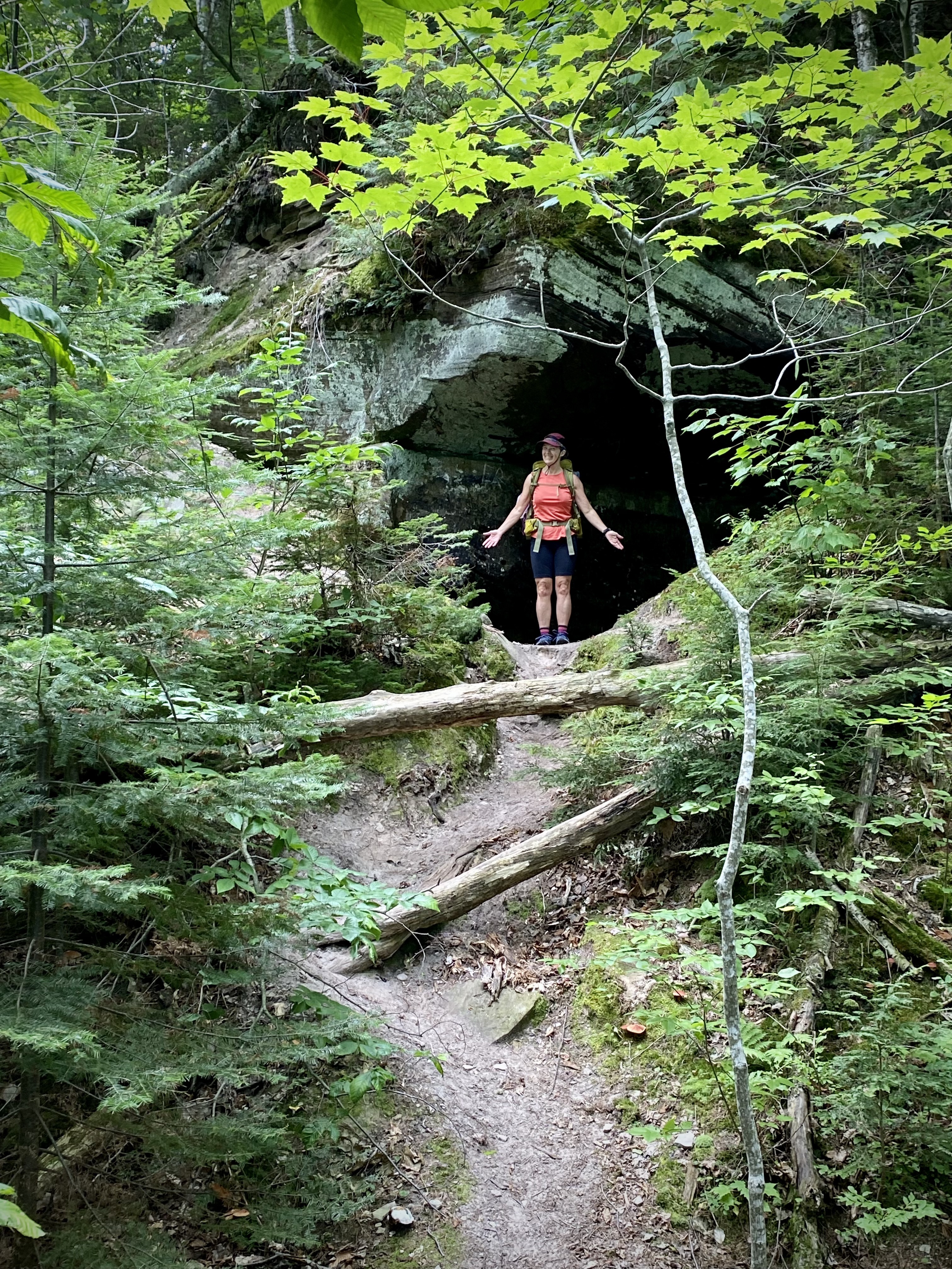 This was a spectacular section of the trail. The terrain was varied, sometimes along the cliffs, others through the forest and up rooted inclines. We had learned to keep distance when going up steep inclines, lest the turtle in front was pulled back by the weight of the backpack “shell”. It was a good challenge and fun! We visited a cave and saw some impressive geological features. We met a young couple on the way to our same campsite from the night before. It was nice to have some conversations along the way.
