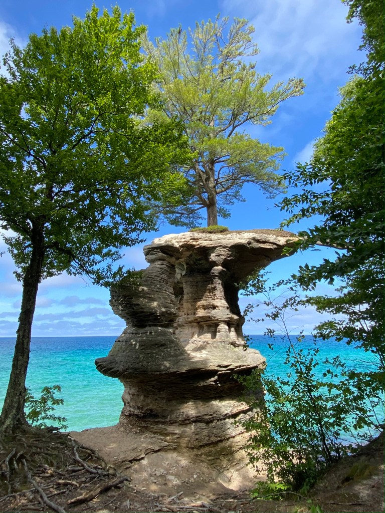 Just before 1:00 PM we arrived at Chapel Rock with a large pine growing from its cap with roots reaching back to its past, keeping it anchored to the landmass.