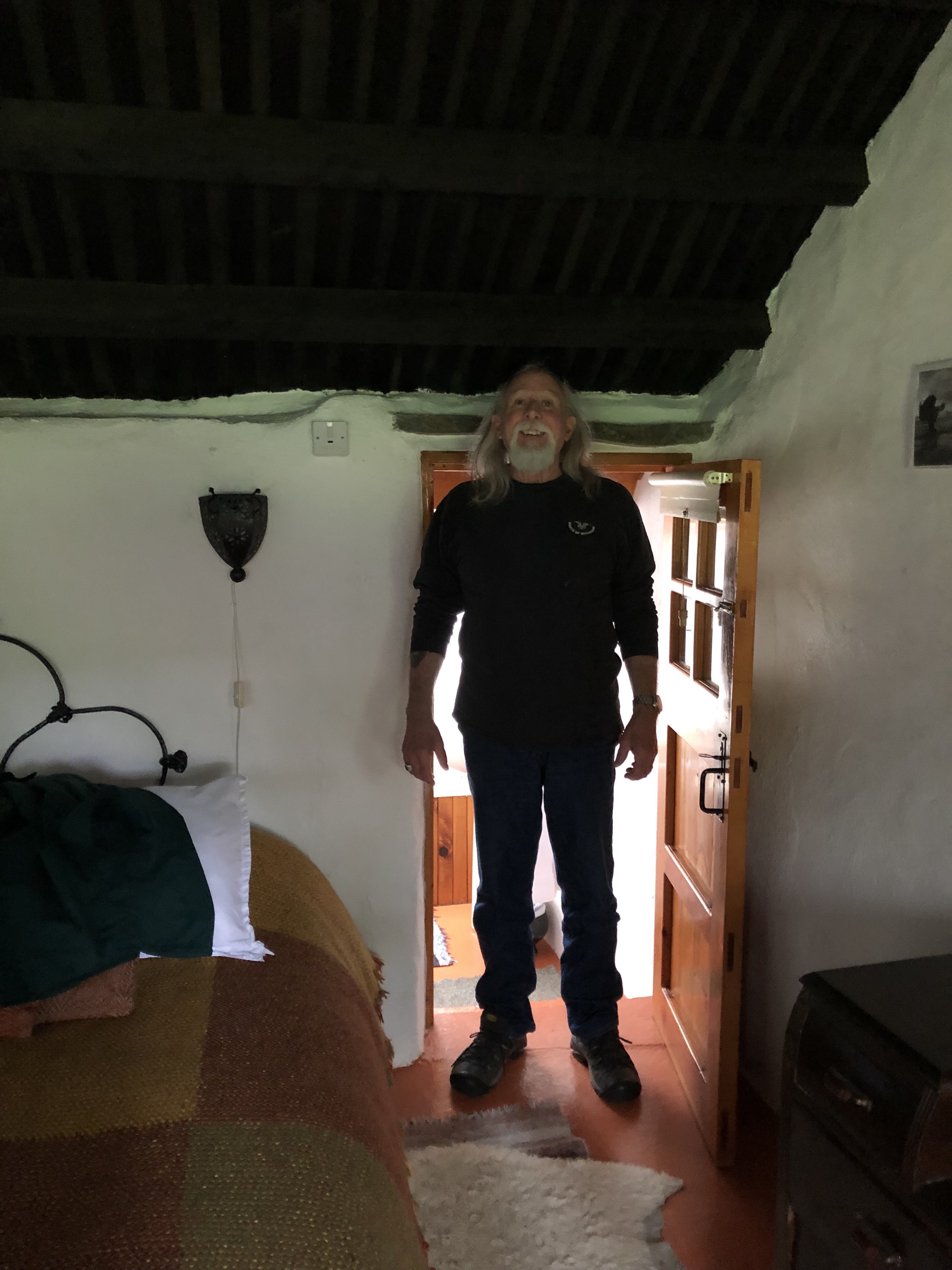 We arrived at the top of a hill that provided beautiful views of the harbor below. Soon after we were greeted by a happy Jack Russel terrier named (we found out later of course), “Bob” or “Robert”. We made our way around several low squatty buildings and found our way into the small main house, filled with Paula and her friend. The ladies were in the process of sprucing up the dining area but had spent the day gabbing instead with everything a bit asunder. They were both delightful and we joined them for some cider and a beer. Paula is a great conversationalist and told us much of the history of The Green Gate. That history included the story of the second to last owner of the property who was born in that house, as was her father. We were shown to our room which is akin to staying in a tiny cottage. Bill has to duck a bit to fit in some of it – definitely to get into the bathroom. Even I have to duck to do that, but it is charmingly different than anywhere we’ve stayed before. I can see outside through the crack in the cabin door and breakfast is served whenever we feel like getting up!