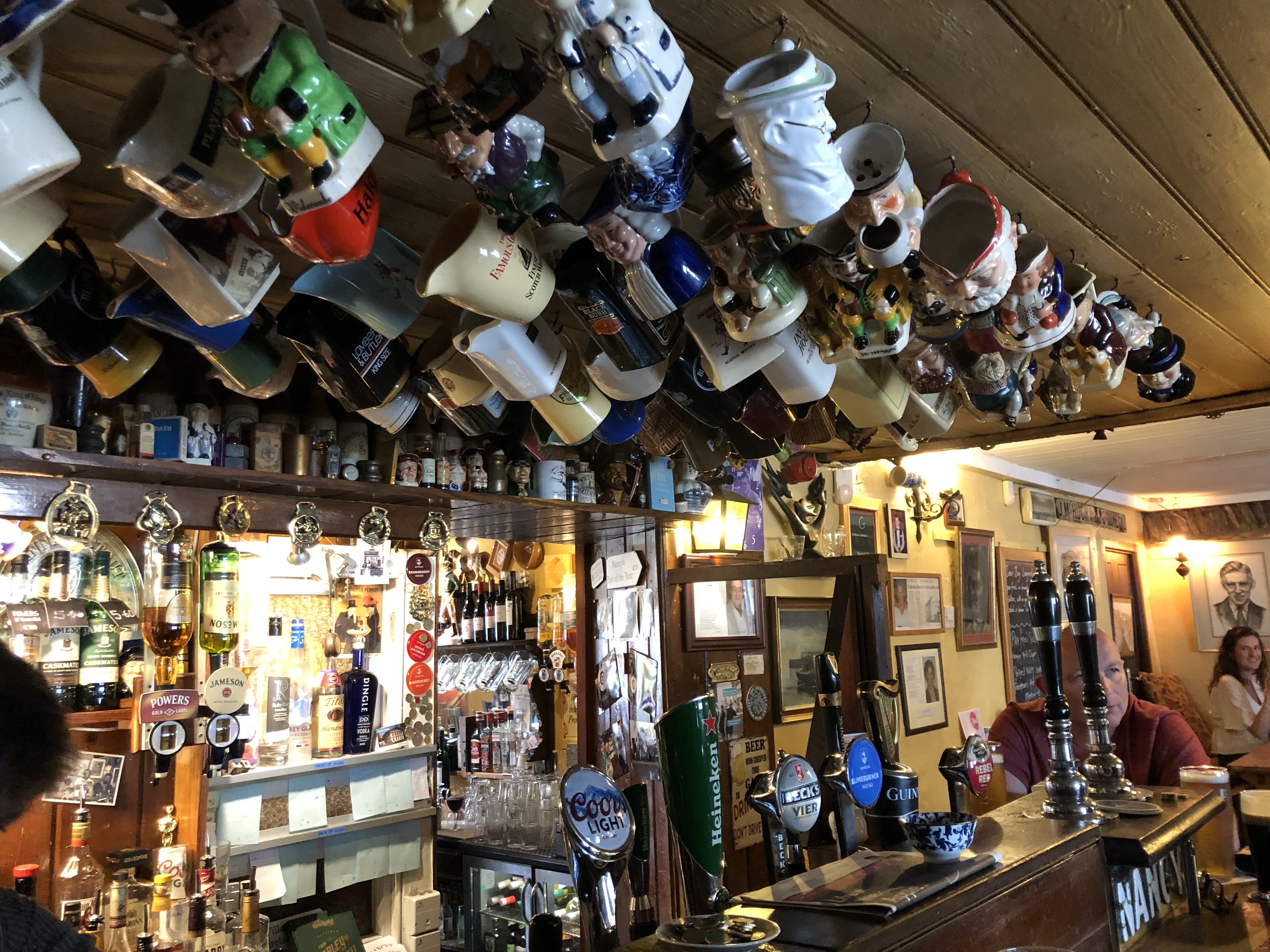 It was my second time having hake, a type of mild fish with a texture like cod. It was served with peas and new potatoes and was quite delicious. From Nancy’s we walked to the Corner House and settled into see if we could stay awake long enough to catch some traditional music. Here we found an honest-to-goodness public house (e.g. pub). As the evening wore on people started filling the place. They all seemed to know each other and sat in little clusters. I sat by the fireplace with a genuine fire therein. The lighting was adequate and not the glare of LED lights. Once the place got busy, a woman (who had appeared to be a customer) popped behind the bar to help serve drinks. We watched several couples (who we identified as visitors) come and go while we sat hunkered in our corner. I’d say we’ve been in friendlier pubs before, but we are patient. I think if we make a return trip we’ll be rewarded with more conversation as two familiar faces instead of one-and-done visitor.