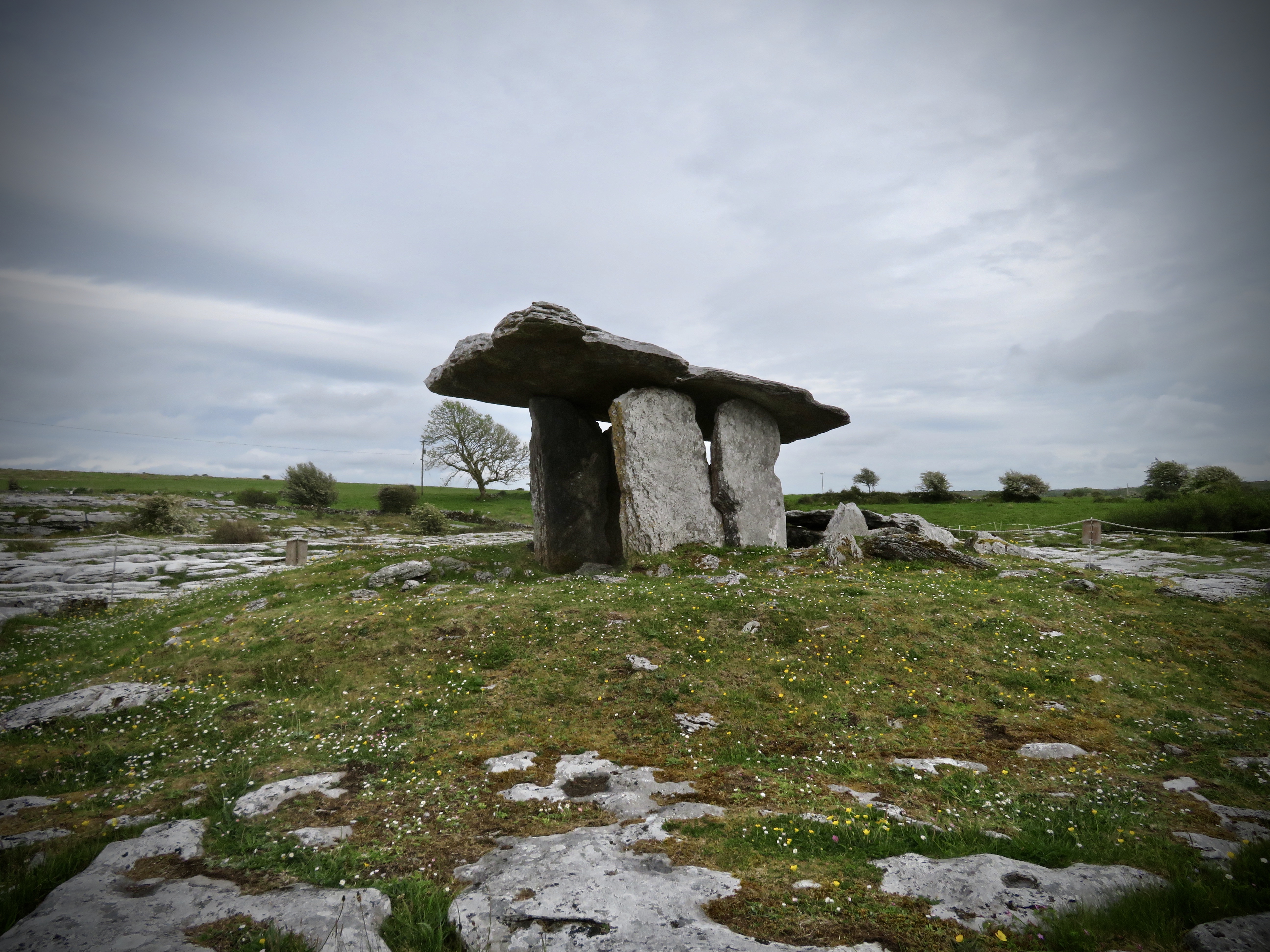 After leaving the caves we gave Bill a call. “Are you in Ireland?” I asked. Indeed he was. Thank heavens! From the caves our last stop was Poulnabrone Dolmen. This is a megalithic burial portal. Excavations determined that the remains of at least 33 individuals were interred here about 3,000 B.C. The first time I visited here we had to climb through a cattle barrier to walk up to the Dolmen. The site has been greatly “improved” with bus parking and a ramp to the dolmen. As fate would happen, we stopped just as a tour guide was herding the riders back into the bus. We actually had the place to ourselves for a short time.