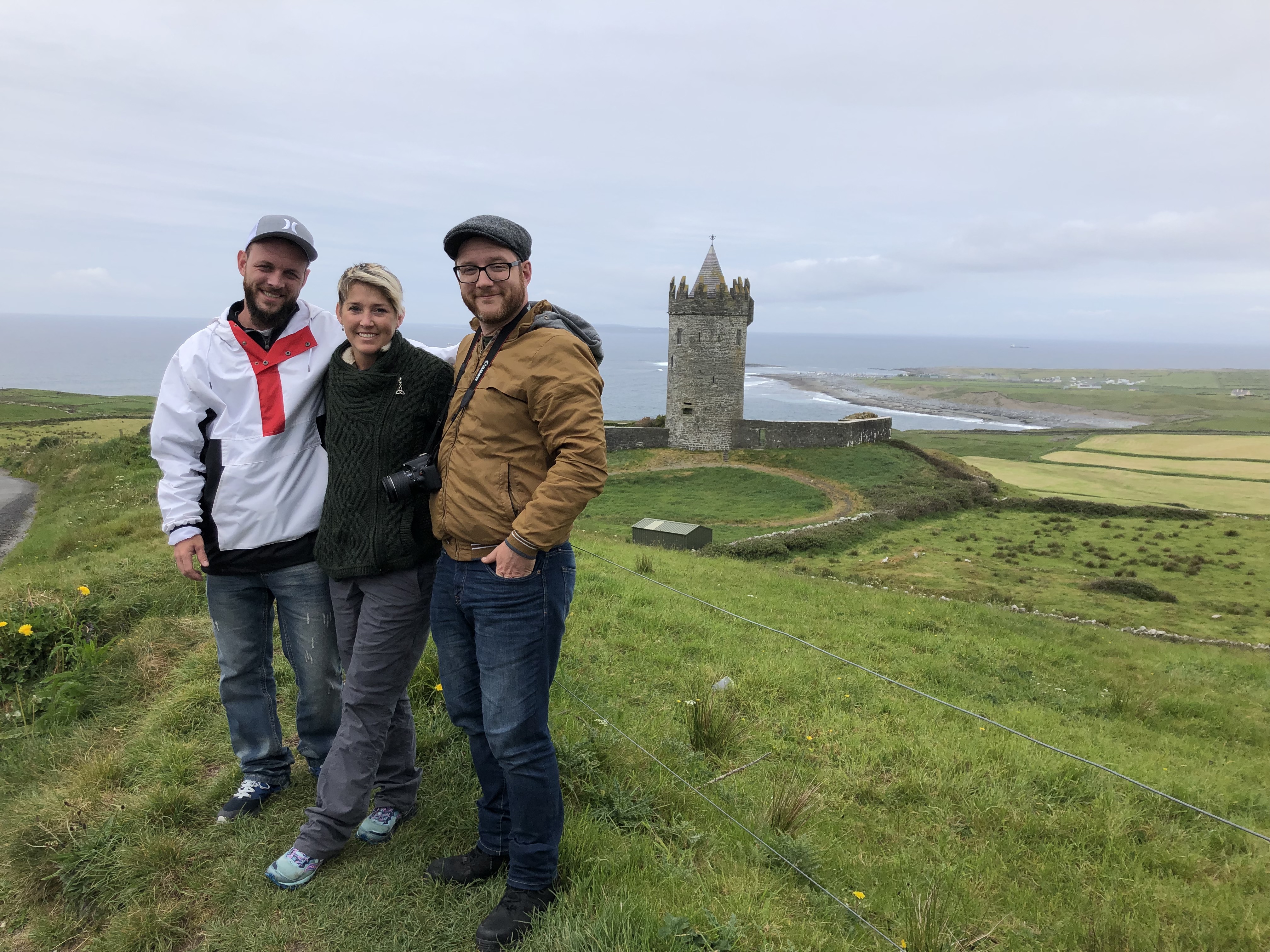 Seana’s headache continued to plague her so she ended up taking more medication to keep it at bay. As a result she was “out like a light” when we arrived at the Cliffs of Moher. I gave the guys a time to meet back at the car if Seana were to awaken and we were to attempt the walk to the cliffs. Sure enough, perhaps 5 minutes after they left she awoke and wanted to give it a try. We went arm and arm up the long walk to the cliffs. They are spectacular to behold. Taylor was wearing a mostly white jacket so I could spot the guys ahead going from one side of the cliffs to the other before we were made it to a viewpoint. I’m glad Seana rallied to see this. It was windy and damp but worth the struggle. I snagged the boys as they were about to head back to the car. We were able to get a group photo at the cliffs.